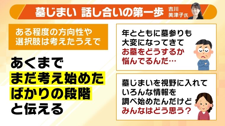「上の世代が亡くなった直後は財産の相続でゴタゴタしがち」と話すのは吉川氏。「墓などについては“平時”に落ち着いて話す」のが大切だということです。