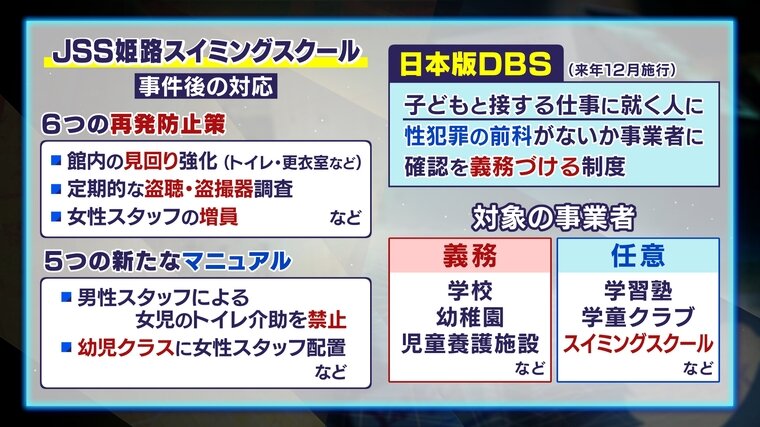 (清水麻椰アナウンサー)「改めて、スイミングスクール側は事件後の対応として、▽館内の見回り強化(トイレ・更衣室など)、▽定期的な盗聴・盗撮器調査、▽女性スタッフの増員、など6つの再発防止策を設けています。そして、▽男性スタッフによる女児のトイレの介助を禁止、▽幼児クラスに女性スタッフ配置、などの5つの新たなマニュアルを設けているということです」