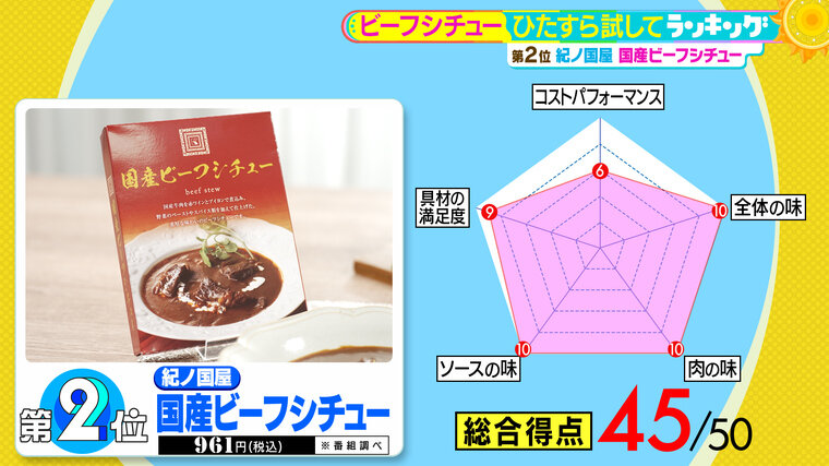 第2位は、紀ノ国屋の『国産ビーフシチュー』(税込961円 ※番組調べ)。