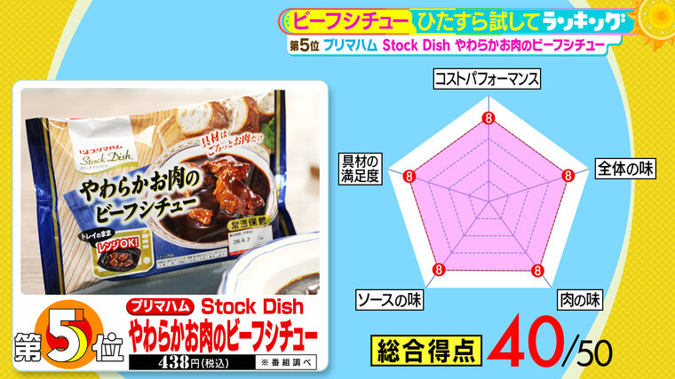 第5位は、プリマハムの『Stock Dish やわらかお肉のビーフシチュー』(税込438円 ※番組調べ)。