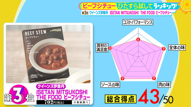 第3位は、クイーンズ伊勢丹の『ISETAN MITSUKOSHI THE FOOD ビーフシチュー』(税込702円 ※番組調べ)。