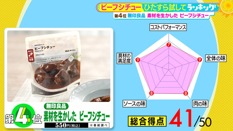 第4位は、無印良品の『素材を生かした ビーフシチュー』(税込550円 ※番組調べ)。