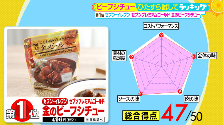 そして第1位は、セブン-イレブンの『セブンプレミアムゴールド 金のビーフシチュー』(税込496円 ※番組調べ)。
