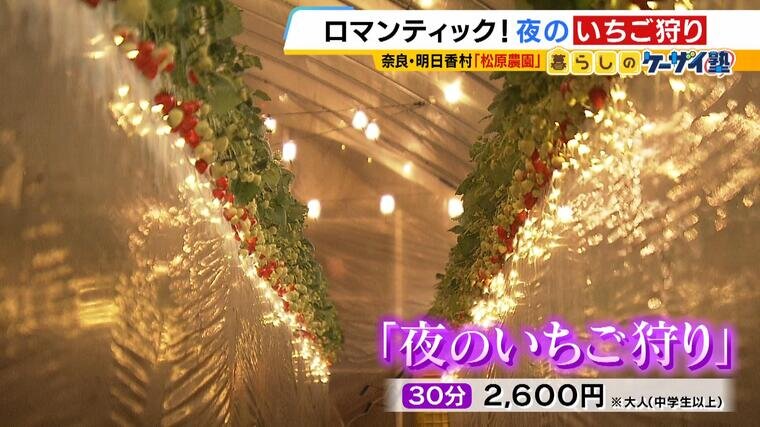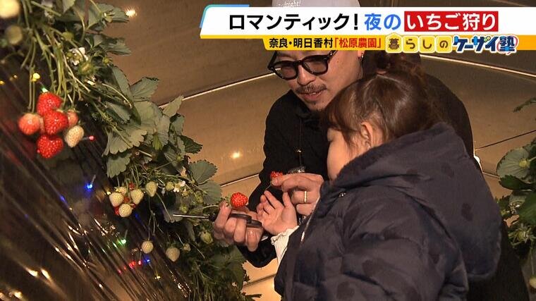 (松原農園 松原実さん)「明日香村は昼は観光客の方、いちご狩りの方ってにぎわう。夜はほんとに寂しい感じですので、明るくしたほうがええのちがうかなと。照明つけて(いちご狩り)させてもらいました」