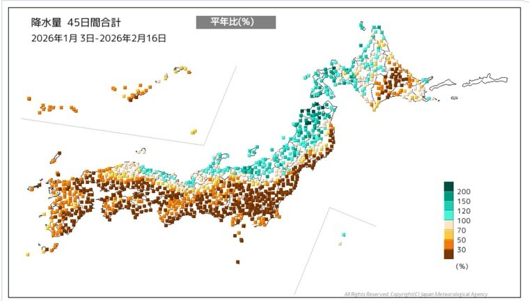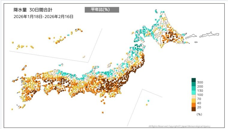 【列島カラカラ...】西日本と東日本太平洋側で降水量の少ない状態続く 統計開始以降1月として最も少雨となった地域も... 大阪で平年比51% 今後も少雨は続く見込み 水の管理や火の取り扱いに注意を