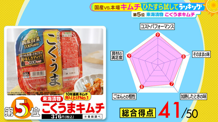 第5位は、東海漬物の『こくうまキムチ』(税込376円 ※番組調べ)。