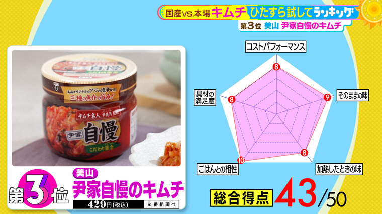 第3位は、美山の『尹家自慢のキムチ』(税込429円 ※番組調べ)。