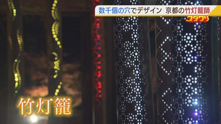 小川さんの工房は京都府福知山市にあります。ここで日夜、竹灯籠づくりに没頭しています。小川さんの竹灯籠の特徴は、ミリ単位でサイズの異なる穴を開けて、繊細な図柄を浮き上がらせるように描くところです。