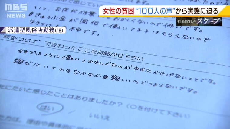 取材班が夜の街の女性ら100人に行ったアンケート調査。とりわけ多かったのが「風俗業」に身を置く女性だった。その内容は切実なものだった。