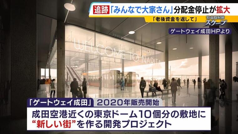 怒りの声をあげるのは不動産ファンド「みんなで大家さん」に老後資金400万円を出資した70代の男性です。その商品というのが「ゲートウェイ成田」。千葉県・成田空港近くにある東京ドーム10個分の敷地につくられるという新しい街で、2020年から販売が始まった大規模開発プロジェクトです。