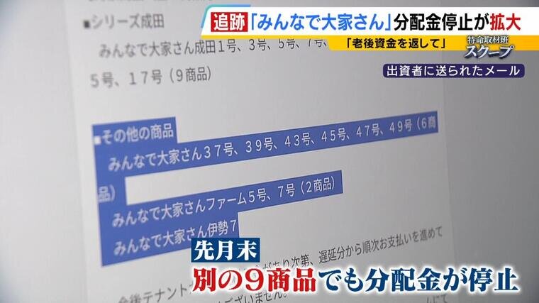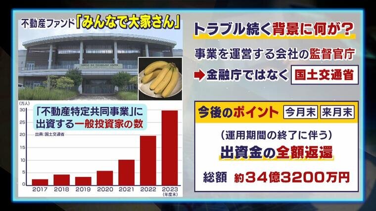 (原田昌彦記者)「10月末と11月末に元本を戻すということが迫っていまして、実際投資家に100%戻すという書類まで交付されています。総額で約34憶3200万円にも上りますが、これが本当に支払われるのか。これも返還されなければ契約不履行、一般の企業で言えば不渡りを出したような状態になります。『みんなで大家さん』の経営は本当に大丈夫なのかという話になってくるので、行政側もそこを注目して動いています」