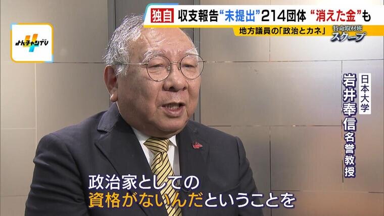 MBSがこれまでに取材したところ、今年3月末時点で報告書を2年連続提出していなかった地方議員などの政治団体は214で、関係する地方議員は198人、首長は3人でした。政党に所属する議員では自民31人、立憲8人、共産6人、維新7人、国民1人、無所属145人となっています。※党・自治体・本人のいずれかから確認