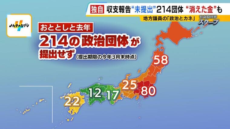 しかし、私たちが全国の都道府県が発行している公報などを調査すると現職の地方議員や首長が関係する214の政治団体がおととしと去年、報告書を提出していなかったことが分かったのです。(提出期限の今年3月末時点)