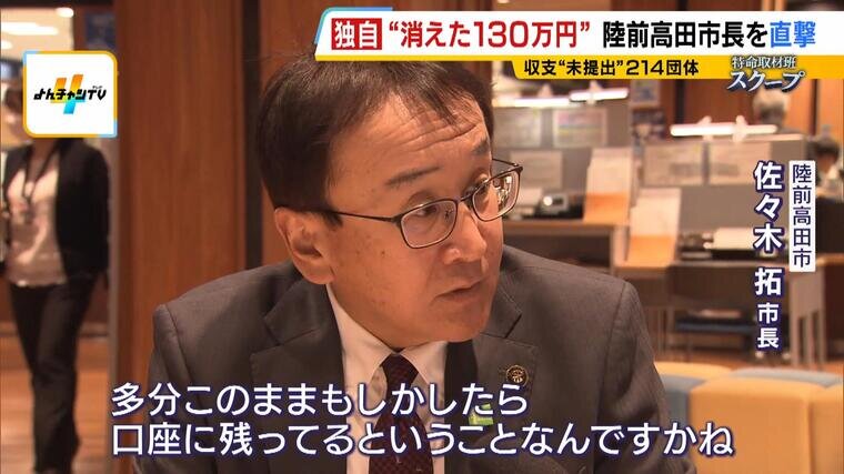 MBSの独自調査で政治資金収支報告書が214の政治団体で未提出だったことが判明しましたが、その後取材を進めると岩手県の陸前高田市の市長の政治団体が2年連続で収支報告書が未提出で解散させられていますが、その繰越していた130万の行方がわからない状態だということです。 “消えた130万円”の行方はどうなっているのか、陸前高田市長へ直撃取材しまいました。