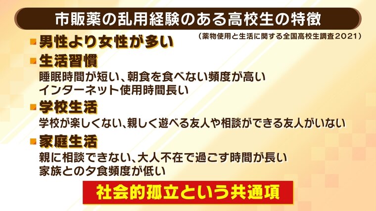 高校生60人に1人が『市販薬を乱用目的で使用した経験』...共通項は学校や家庭での孤立 医師「つらさを免れたいと始めるケースが多い」【オーバードーズ】