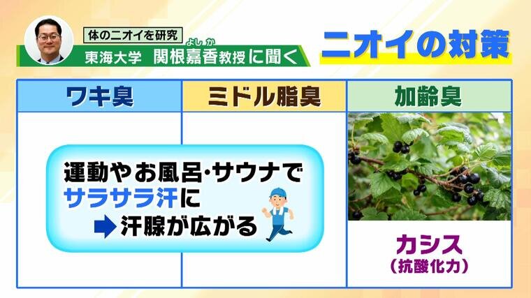 体のニオイを研究している東海大学の関根嘉香教授によりますと、ワキ臭やミドル脂臭に関しては、運動・お風呂・サウナで普段から汗をよくかいておくと、汗腺が広がり汗がサラサラになるということです。
