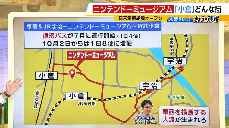 さらに、「京阪&JR宇治駅~ニンテンドーミュージアム~近鉄小倉駅」の循環バスが今年7月に運行開始しました(1日4便)。10月2日からは1日8便に増便するということです。東西を横断する人の流れが生まれるようになります。