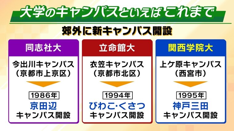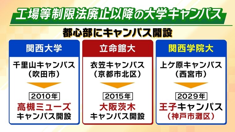 関西大学が2010年に高槻ミューズキャンパスを、立命館大学が2015年に大阪茨木キャンパスを開設しました。そして、関西学院大学は2029年に王子キャンパスを開設予定です。