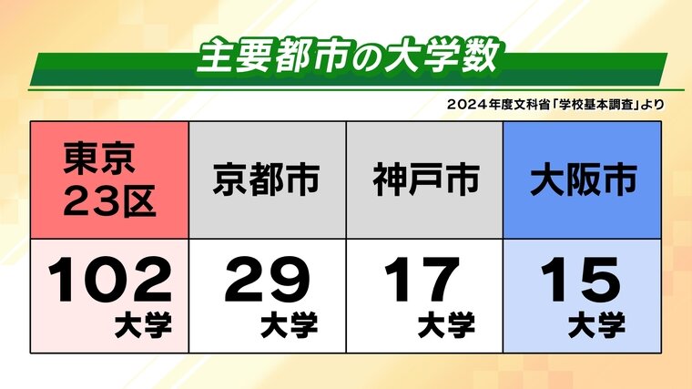 主要都市の大学数を見てみると(2024年度・文科省「学校基本調査」)、東京23区に102大学、京都市に29大学、神戸市に17大学がある一方で、大阪市内に15大学しかありません。