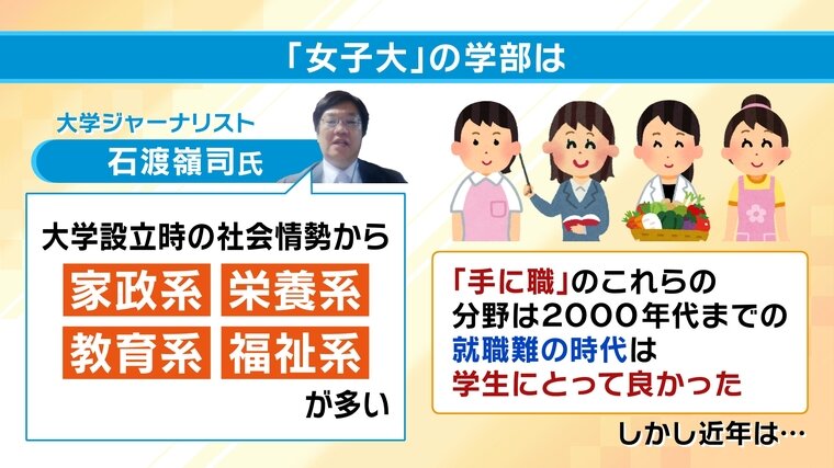 石渡嶺司氏によると、女子大学は大学設立時の社会情勢から「家政系」「栄養系」「教育系」「福祉系」が多いということです。「手に職」のこれらの分野は2000年代までの就職難の時代は学生にとって良かったといいます。しかし近年は、これらの職種の給料が比較的安いことに加え、キャリア構造の変化で女性は専門職から総合職に、男女関係なく就きたい職業に就けるようになったことで、こうした学部のニーズが減りつつあるということです。
