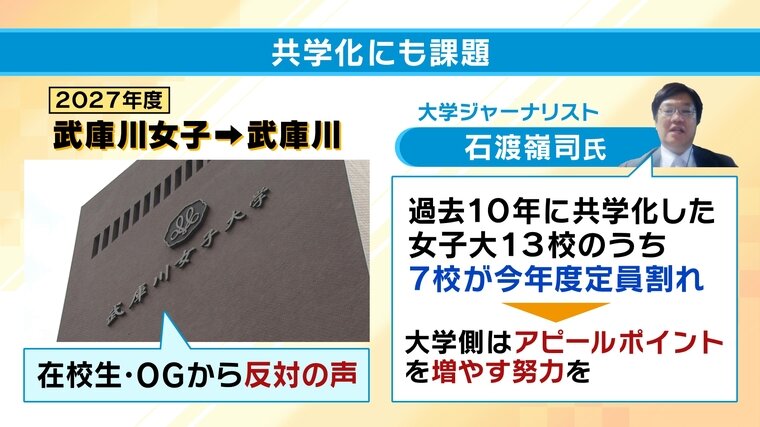 特に衝撃が走ったのが武庫川女子大学の共学化。大学ジャーナリスト・石渡嶺司氏は「ここまで大規模な女子大学が共学化するというのは前例がなかった」と話し、実際に反対署名も集まっているということで社会に大きな影響を与えているということです。
