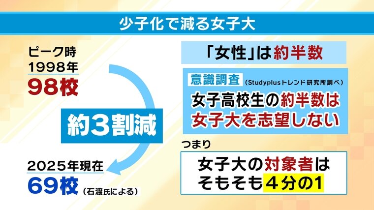 日本は現在、少子化が進んでいるため、大学全体が厳しい経営状況になってきています。特に女子大学は、1998年のピーク時に98校あったのが、2025年現在69校(石渡氏による)と、約3割減っています。