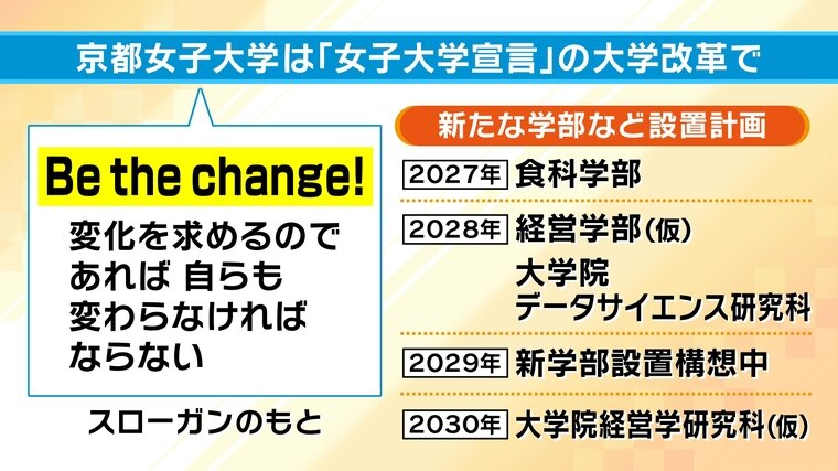 京都女子大学は会見で「Be the change! 変化を求めるのであれば自らも変わらなければならない」というスローガンのもと、新たな学部などを設置する計画を進めるということです。