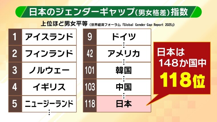 上位ほど男女平等といわれるジェンダーギャップ(男女格差)指数で、日本は148か国中で118位となっています(世界経済フォーラム「Global Gender Gap Report2025」)。