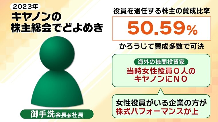 一体何があったのか。2年前、キヤノンの役員を選任する株主総会で、当時キヤノンの女性の役員候補がゼロだったということに対して、海外の機関投資家などが「女性の役員の候補者がある程度の数いないと議決に反対する」というルールのもと、反対にまわったのです。結果的に役員の選任は賛成50.59%でかろうじて可決されましたが、大きな動揺が広がりました。