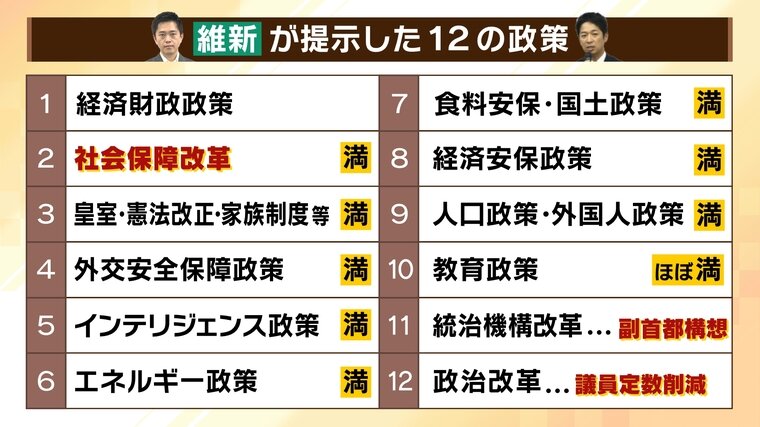 維新の藤田文武共同代表によりますと、▽2.社会保障改革、▽3.皇室・憲法改正・家族制度等、▽4.外交安全保障政策、▽5.インテリジェンス政策、▽6.エネルギー政策、▽7.食料安保・国土政策、▽8.経済安保政策、▽9.人口政策・外国人政策については「満額」回答、▽10.教育政策に関しては「ほぼ満額」の回答だったということです。