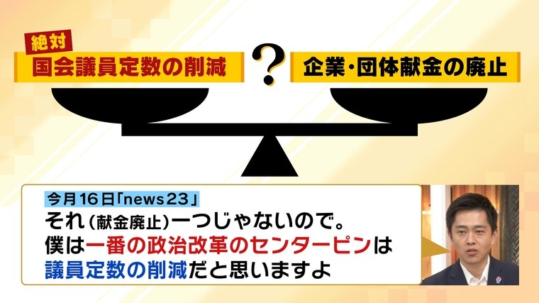 維新の吉村代表は16日出演のテレビ番組で「それ(献金廃止)一つじゃないので。僕は一番の政治改革のセンターピンは議員定数の削減だと思いますよ」と発言。