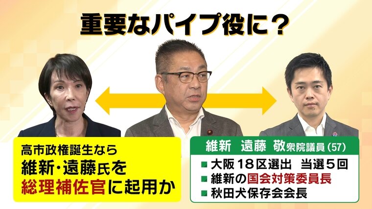 高市政権ではこの遠藤氏が総理補佐官に起用され、両党をつなぐ重要なパイプ役になることが予想されています。