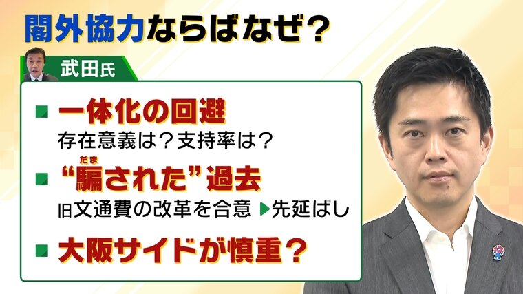 閣内協力であれば維新が法案や予算案に賛成することをより確実に担保でき、政権の安定感を向上させることができるということで、維新の吉村代表は自民党側から「閣内に入ってもらいたい」という要望があったと話しています。