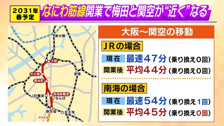 近い将来、梅田にもインバウンドが増加する可能性があります。なにわ筋線が開業(2031年春予定)すれば、梅田-関空の移動時間が短くなるからです。