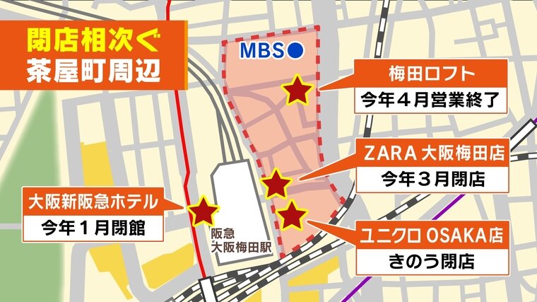 グランフロント大阪やグラングリーン大阪など、大型開発が次々と行われてきた梅田駅北西部「ウメキタ」エリア。一方、4月に梅田ロフトが営業終了し、10月にユニクロが閉店するなど、「茶屋町」エリアでは閉店が相次いでいます。 茶屋町はこの先どうなってしまうのか? 事業用不動産を扱うCBRE関西支社コンサルティング部の魚見修平氏・洞口侑士氏に取材したところ、閉店が相次ぐ中でも「テナント需要が高い」と言える理由があるといいます。一体どういうことなのか、MBS福島暢啓アナウンサーがプレゼンテーションした内容をもとにまとめました。