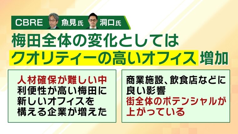 梅田全体を見ると、「クオリティーの高いオフィス」が増加していると魚見氏・洞口氏は指摘。人材確保が難しいなか、利便性が高い梅田に新しいオフィスを構える企業が増えているそうです。また、それが商業施設・飲食店などに良い影響をもたらし、「街全体のポテンシャルが上がっている」ということです。