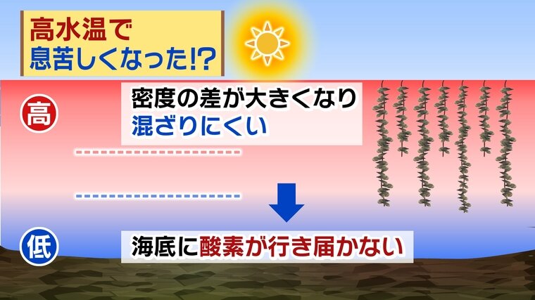 2つ目は、「高水温で息苦しくなった」可能性です。高水温のときは、海面に近いところは温度が高く、海底に近くなると温度が低くなります。この温度差があまりなければ、風などで海水が混ざりあいますが、温度差があると密度の差が大きくなってしまうことで海水が混ざりにくくなり、海底に酸素が行き届かず、カキが弱ってしまったと考えられるということです。