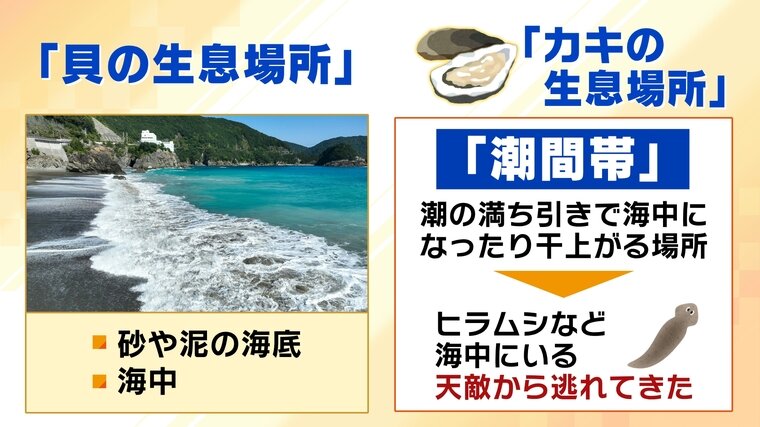 これはヒラムシなど海中にいる天敵から逃れてきたためで、カキは生物にとって厳しいところに生息しているということです。