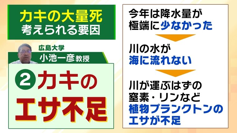 今年は降水量が極端に少なかったため、川の水が海に流れなくなり、川が運ぶはずの窒素・リンなど植物プランクトンのエサが不足してしまったということです。そしてカキのエサとなる植物プランクトンが少なくなってしまったということが考えられます。
