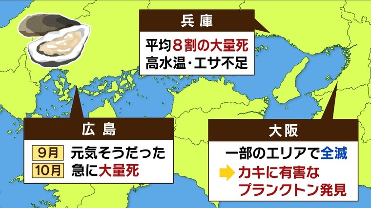 また、大阪ではカキに有害なプランクトンが発見され、一部のエリアでカキが全滅してしまったということです。