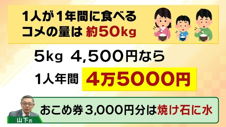 「おこめ券3000円分は焼け石に水」と話すのは山下氏。1人が1年間に食べるコメの量は約50kgで、5kg4500円で計算すると、1人年間4万5000円の出費となります。家計にもたらす恩恵は限定的であるかもしれません。