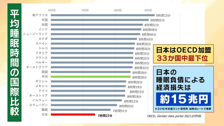 日本の平均睡眠時間は「7時間22分」で、OECD加盟33か国中最下位。平均(8時間28分)より約1時間も少なくなっています(OECD, Gender data portal 2021より)。
