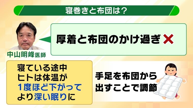 なお、体の深部体温が下がったときにヒトは眠くなるため、「厚着と布団のかけ過ぎ」はNG。くつ下をはきながら、あるいは、電気毛布をつけっぱなしにして寝ると、体温調節機能が働かなくなるため避けた方が良いそうです。冷え性の人は、温かい飲み物などを活用するようにしてください。