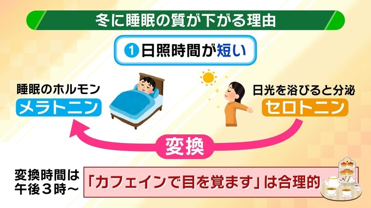 1つ目は、日照時間の短さです。日光を浴びることで分泌される「セロトニン」は、15時ごろから睡眠のホルモン「メラトニン」に変換されますが、冬は日照時間が短いためセロトニンの分泌量が減り、それに伴ってメラトニン分泌量も減少するため睡眠の質が下がるのです。