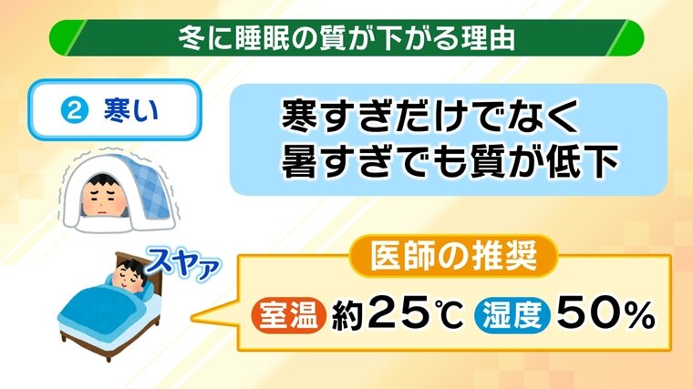 2つ目の理由は、寒さ。暑すぎても寒すぎても睡眠の質は下がります。医師が推奨するのは、「室温約25℃」「湿度50%」。しかし、日本の寝室の平均室温は平均12.8℃と世界的に見ても低く、推奨室温の約半分となっています。