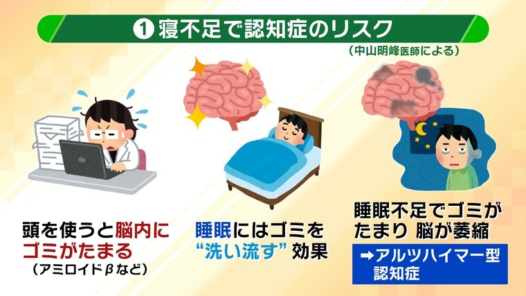 頭を使うと脳内にゴミ(アミロイドβなど)がたまりますが、睡眠にはこのゴミを“洗い流す”効果が。睡眠不足でゴミがたまると脳が萎縮し、アルツハイマー型認知症につながります。