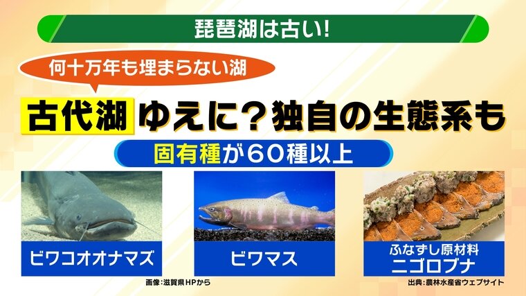 この長い歴史が生み出したと言われるのが、ビワコオオナマズやビワマス、ニゴロブナ(ふなずしの原材料)といった固有種を中心とする独自の生態系です。
