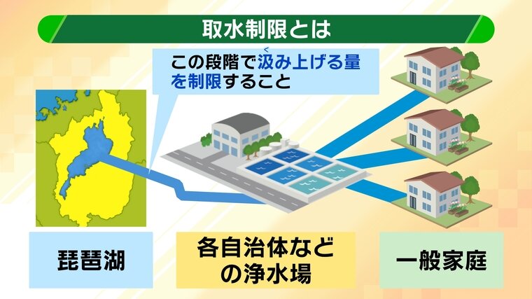 また、琵琶湖の水位と態勢について、マイナス65cm程度から “イエローカード”状態となり、マイナス90cm程度で取水制限開始となります。
