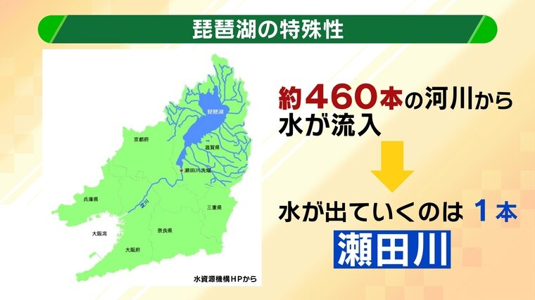 約460本の河川から水が流入しているのに対し、水が出ていくのは「瀬田川」の1本だけだという点も大きな特徴です(河川以外の流出口としては、ほかに京都への水を運ぶ「琵琶湖疎水」も)。