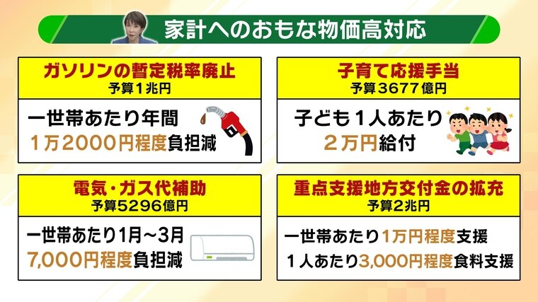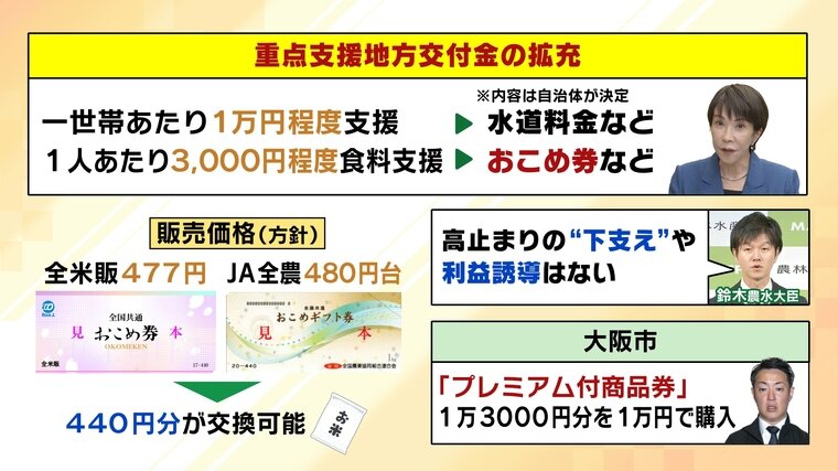 家計への主な物価高対策の1つが「重点支援地方交付金の拡充」。具体的な支援内容は各自治体が決定しますが、国が“推奨メニュー”を提示していて、その1つが現在物議を醸している「おこめ券」です。